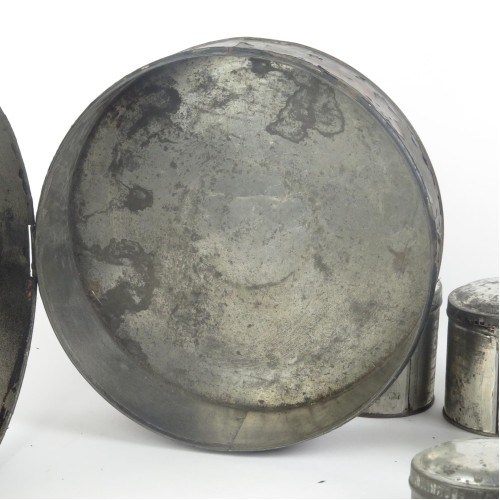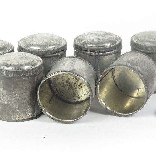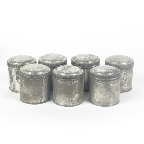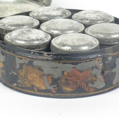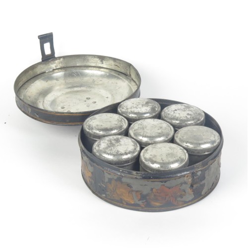Antique, used condition, surface wear throughout, original paint is fragile and peeling with significant loss, lock missing a piece through which you would insert a lock (pictured), no lock included, scratching and loss to the silver finish of the inside and the tins. See photos.